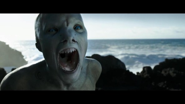 Tornando alla pellicola, se conoscete il Gens anche solo per Frontiers o solo per The Divide, saprete che ha un tipo di regia molto sporca, con un montaggio frenetico e in certi casi utilizza anche la telecamera a mano. In Cold Skin invece non ho notato nessuno di questi elementi. La regia è lenta e calma, in certi momenti si concentra sull’inquadrare le azioni che compiono i personaggi (anche quelle di tutti i giorni) e in altri punti invece fa delle belle panoramiche sul paesaggio insulare, che è veramente stupendo, un luogo antico e misterioso in cui l’uomo sembra non aver mai messo piede oppure un luogo dove l’uomo non può stare. Inoltre anche il montaggio sarà calmo e gestito molto bene pure nelle scene d’azione. Nelle scene in cui il protagonista interaggirà e lotterà contro di loro non vedremo tagli netti e improvvisi, ci saranno molte inquadrature lunghe e pochi stacchi, mentre nelle scene d’azione sarà presente un montaggio più veloce ma sempre controllato e qui Gens dimosterà di saper girare bene queste sequenze nonostante tutti i limiti tecnici.