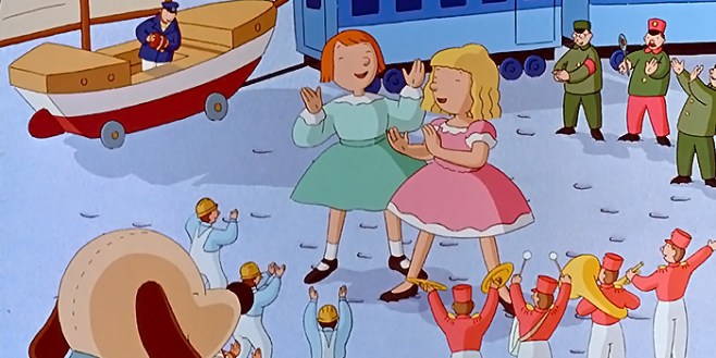 Un elemento che apprezzo tantissimo fi questa pellicola riguarda sicuramente i disegni. Lo stile è molto particolare e ciò che risalta fin da subito è la linea chiara (o ligne claire) ossia un tipo di disegno con dei tratti molto puliti e leggibili, con linee nere e morbide ma soprattutto questo è uno stile che si basa sulla semplicità e che evita di utilizzare troppi dettagli o eccessi. Praticamente questo stile ricorda molto i fumetti franco-belga come ad esempio Le avventure di Tintin. Nei film successi di D’Alò e della Lanterna Magica lo stile cambierà ma in questa storia è assolutamente perfetto visti che sembra fatto apposta per ricordare una favola. Il disegno quindi è ottimo e anche le animazioni sono realizzate molto bene con i personaggi che si muovono con grande energia specialmente nei momenti comici. Inoltre D’Alò non si limita a questo ma fa varie panoramiche della cittadina per poter dare profondità all’ambiente e anche ai personaggi. In questo caso il regista riesce nell’intento quando riprende Scarafoni che vola con la scopa della Befana o il pilota dell’aereo giocattolo quando va in perlustrazione o affronta Scarafoni stesso. E qui possiamo vedere l’impegno e lo sforzo usato per realizzare queste scene che sono fatte davvero bene. Mi piace anche come l’ambientazione notturna e la cittadina innevata riescano a trasmettere il senso di magia e bellezza.