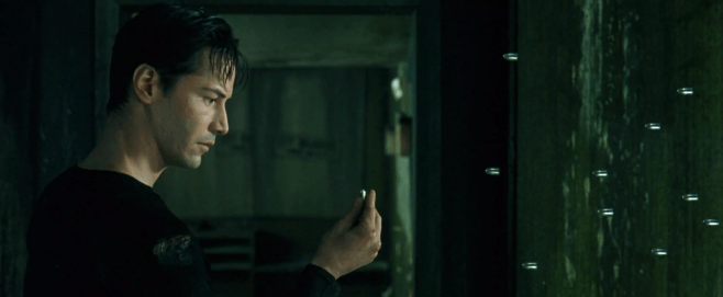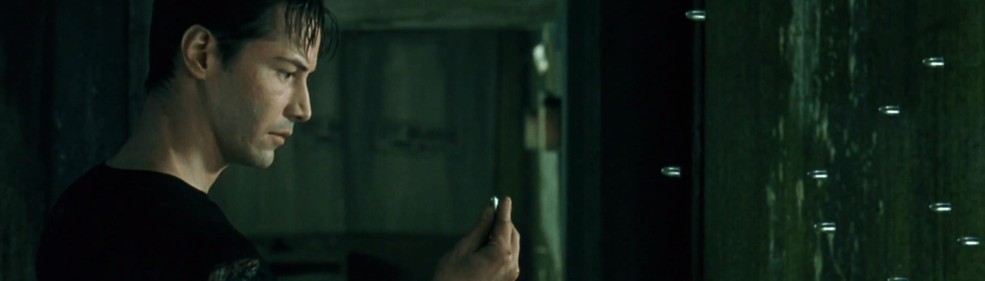 Un giorno viene contattato da Trinity che lo avverte che Morpheus (Laurence Fishburne), un uomo ricercato e considerato pericoloso, lo vuole vedere perché ha le risposte che cerca. Purtroppo però gli agenti arrivano per primi a Neo. Tra questi c’è l’agente Smith (Hugo Weaving) che decide di tenerlo sotto sorveglianza installandogli una cimice nel corpo. Dopo che il gruppo di Trinity lo porta con loro e gli rimuovono dal corpo la cimice, Neo incontra finalmente Morpheus. Quest’ultimo gli offre una scelta: o Neo decide di dimenticare l’intera questione e di continuare con la vita di tutti i giorni oppure accetta di farsi mostra l’intera verità su Matrix e la vita che ha sempre visto. Però la verità potrebbe non piacergli. Nonostante tutto Neo decide di voler sapere e Morpheus gli mostra un mondo distrutto e governato dalle macchine. E lui è la loro unica speranza perché Morpheus crede che sia l’eletto.