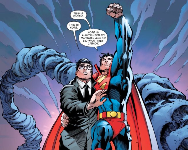 Lo vedremo spesso ferito, stanco, a terra e ridotto molto male, lo vedremo sempre arrivare al limite eppure, nonostante la sofferenza e i dubbi che lo attanagliano, non lascerà perdere, non si arrenderà. Andrà avanti e rifletterà su tutto ciò che ha fatto in passato, sulle persone che ha salvato, sulle persone che non è riuscito a salvare e che non riuscirà a salvare in futuro. Lo vediamo preoccupato per le sorti della Terra in sua assenza ed è molto interessante vedere le sue ansie e preoccupazioni per la vita di Lois Lane nel capitolo in cui aspetta un turno infinito per far una telefonata da un’altra galassia. Forse uno dei miei capitoli preferiti è quando uno strano fulmine divide Superman in due entità: la parte umana, con le sembianze di Clark Kent, e quella kryptoniana, con le sembianze di Superman. Quella kryptoniana è la parte razionale e fredda, quella che dice di lasciar perdere Alice, di tornare sulla Terra dove hanno bisogno di Superman, mentre la parte umana non vuole lasciar perdere, ha ancora speranza e vuole salvare la bambina. Un ottimo capitolo introspettivo che mostra la vera forza di entrambe le parti, di come si completino e rendano Superman l’eroe che conosciamo.