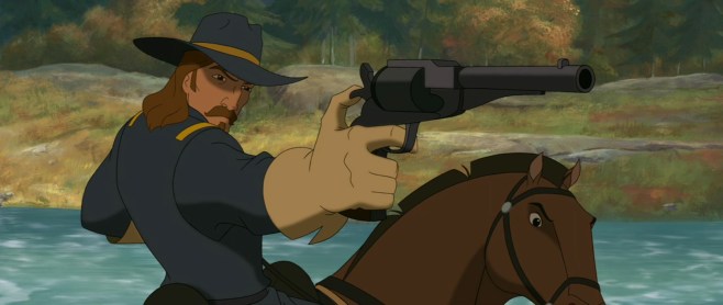Quello che ho apprezzato molto è anche la sceneggiatura, una sceneggiatura che celebra la natura in maniera molto intelligente, attraverso la storia di questo cavallo indomabile che vuole tornare a casa e attraverso il suo viaggio nel selvaggio West, scoprendo una natura ancora incontaminata e selvaggia quanto lui. In questo viaggio Spirit imparerà a conoscere l’essere umano, a conoscerne i lati negativi attraverso il colonello e i suoi soldati ma anche quelli positivi attraverso Piccolo Fiume e la sua tribù. Questa consapevolezza dell’essere umano crescerà pian piano dentro Spirit e se prima era molto titubante e li considerava strani e pericolosi, a un certo punto imparerà anche ad apprezzarli e a capirli di più, soprattutto Piccolo Fiume. Il rapporto che c’è tra Spirit e Piccolo Fiume inoltre scalda veramente il cuore. Come ho detto in precedenza, Spirti non parla e i suoi pensieri non sono inseriti spesso, quindi tutto si basa sulle immagini, sui gesti e gli sguardi e il rapporto che cresce tra i due viene percepita in maniera del tutto onesta. Ovviamente Spirit all’inizio non si fida, dopo la brutta esperienza con il colonello, ma pian piano tra i due si instaura un profondo affetto e soprattutto rispetto, con Piccolo Fiume che comprende e accetta che il cavallo non si farà mai domare e Spirit che invece ne riconosce la sua bontà e la sua dolcezza. Il tutto avviene senza essere mai smielato e ciò succede anche in altre occasioni, che sia con Spirit che interagisce con la madre o con altri cavalli o con Pioggia. Il colonello infine si dimostra un ottimo villain. Lui è un uomo molto serio che predilige l’ordine e la disciplina ma che si dimostra anche spietato e freddo, oltre che essere testardo tanto quanto Spirit. La rivalità tra i due è realizzata molto bene ma ho apprezzato soprattutto come anche un personaggio come lui alla fine arrivi a provare rispetto per Spirit.