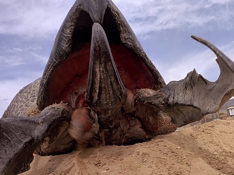 Quando finalmente i Graboid si faranno vedere, la regia continuerà a dar prova d’ingegno sia nelle numerose situazioni che si verranno a creare sia per le tecniche che metterà in atto. In quest’ultimo caso dobbiamo ricordarci che il film è costato poco e in modo intelligente che hanno usato per ovviare a ciò è riprendere i Graboid mentre si muovono sottoterra, facendo innalzare e smuovere il terreno e riuscendo così a creare tensione perché ciò sottolinea la loro presenza. Un’altra strategia è stata quella di mostrare molto spesso le lingue tentacolari che usano per afferrare le persone attraverso le mandibole, molto più semplici da gestire rispetto a un mostro gigantesco, ma usati sempre in maniera funzionale. Ci sono tante belle idee registiche che vengono messe in atto come ad esempio il punto di vista degli Graboid che si muovono sottoterra, gli effetti vertigo per aumentare la tensione e un montaggio curato quando le creature attaccano. Inoltre ci ritroveremo davanti sempre situazione diverse, sempre pronti a evolversi in maniera inaspettata, rendendo la storia più dinamica e arrivando a strategie per fronteggiare i mostri che sono semplici ma intelligenti, come la fuga sulle rocce con le aste e i piani per distrarre i Graboid, che si muovono sentendo le vibrazioni, e raggiungere le montagne (e gli stessi mostri mostreranno una grande capacità di adattamento, mettendo in difficoltà i protagonisti). C’è grande diversificazione ed è anche questo, oltre alla commedia e ai personaggi, a rendere il film divertente.