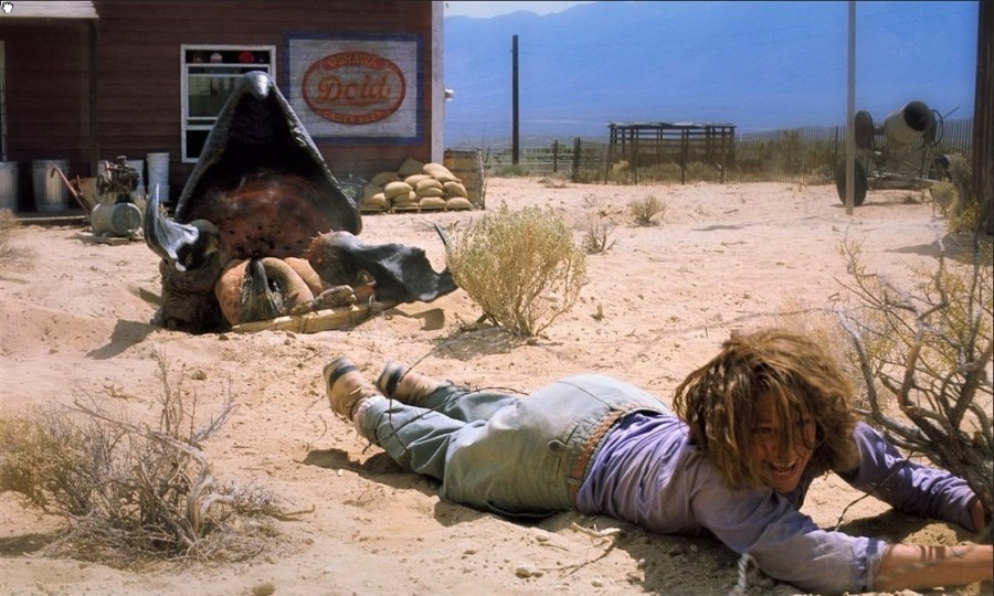 L’uso degli effetti artigianali è davvero ottimo, anche in questo caso semplice ma funzionale, come ad esempio l’Emporio di Chang, un edificio costruito in modo che potesse crollare e poi tornare come prima se dovevano rigirare la scena. E il design dei Graboid, progettato dalla Amalgamated Dynamics, è diventato iconico, semplice e riconoscibile, ma con caratteristiche specifiche come le tre lingue tentacolari con mandibole con cui afferra le sue vittime, la testa con tre mandibole che si aprono come un fiore e le punte poste sul suo corpo che usano per muoversi sottoterra. Un design che ancora oggi sa sorprendere anche se ad alcuni ricorda un po’ Shai Hulud del Dune di David Lynch. Il lato tecnico è ottimo e possiede un ritmo che non annoia mai, ma un altro elemento che apprezzo è la sceneggiatura e in particolar modo i personaggi.