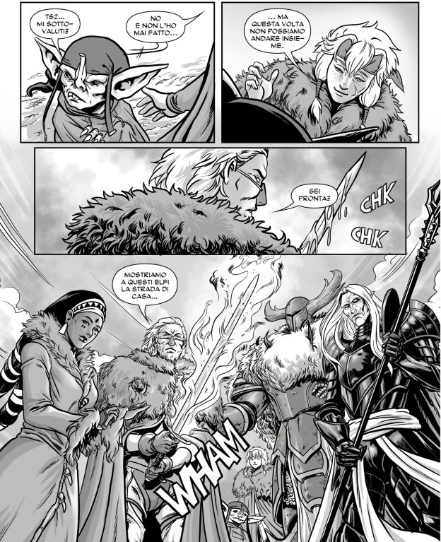 Si parte come al solito parlando del disegno che questa volta viene curato da Giulio Riosa. Il disegnatore qui mostra subito dei tratti molto scuri e spessi, ben realizzati e capaci di dare ricchezza ai personaggi. Quest’ultimi hanno dei tratti più dolci e rotondi e soprattutto mostrano una grande quantità di dettagli nel volto, nei capelli e anche nel vestiario. I volti posseggono numerose caratteristiche attraverso rughe, zigomi, cicatrici e molto altro, infatti apprezzo molto com’è stato realizzato qui Calon. Anche le armature saranno ben curate ma adoro l’attenzione posta in particolar modo per il capelli, come ad esempio quelli di Leena quando sono sciolti, oppure le barbe dei nani. Nei personaggi c’è grande attenzione, un po’ meno a volte nelle ambientazioni che in certi casi riescono a essere ricchi mentre a volte risultano quasi accennate. Quello che riesce a fare bene il disegnatore è il ritmo. La storia scorre veramente bene, anche quando ci sono delle spiegazioni non ho avvertito alcun tipo di rallentamento (com’era successo invece in qualche volume precedente) e le scene d’azione mostrano un ottimo dinamismo e sono capaci di intrattenere.