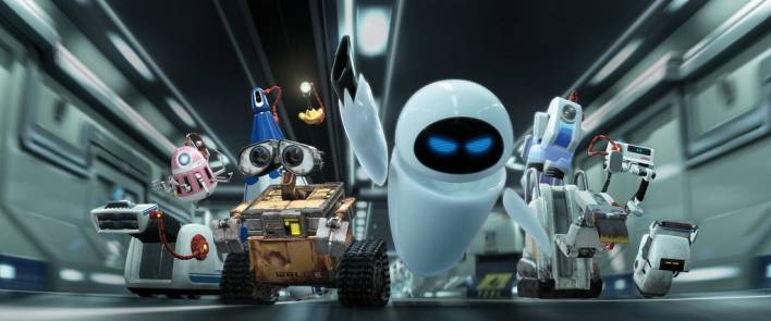 Quello in cui però eccelle è la capacità di riuscire a raccontare molto bene la storia attraverso le immagini, anche perché, e questa è stata una scelta veramente coraggiosa, la prima parte del film sembra quasi un film muto. Ci sono pochissimi dialoghi, quello che sentiamo vengono da alcune pubblicità ancora in funzione e WALL-E ed EVE pronunciano al massimo qualche singola parola e soprattutto i loro nomi. Per il resto ci sarà solo il silenzio e tramite esso potremo comunque capire tante cose sulla situazione. Capiamo che gli umani se ne sono andati, che WALL-E è l’ultimo robot ancora attivo e capiamo perfino che, prima di scappare dalla Terra, gli umani erano circondati da un consumismo estremo che li ha portato alla rovina. E il tutto emerge solo attraverso le immagini. Come se non bastasse nella seconda parte le cose cambiano parecchio ed è un cambiamento che funziona benissimo. Se il lato tecnico è eccellente, la storia lo è altrettanto.