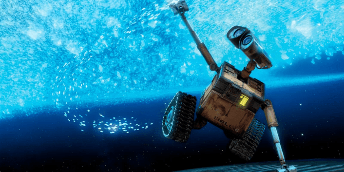 Ci sono tantissimi design che riescono a colpire, come ad esempio gli altri robot moderni che WALL-E incontrerà o la nave spaziale Axion, ma tra tutte le cose sono rimasto impressionato dall’aspetto della Terra. Fin dalla prima inquadratura che mostra il globo, capiamo che sta male attraverso il colore giallo spento e quando ci avviciniamo troviamo un mondo decadente, abbandonato e sommerso da enormi quantità di rifiuti, tra cui alcuni che i vari WALL-E hanno imballato e messo gli uni sopra gli altri, arrivando a creare dei palazzi enormi. Non è stato solo l’aspetto a colpirmi, ma anche l’illuminazione, uno degli elementi più belli della pellicola. Perché è proprio l’illuminazione a dare alla pellicola, all’inizio, questa sensazione di malinconia ma anche di sporco e inquinato. Ovviamente l’illuminazione cambierà a seconda delle locations ma non solo. Infatti quando ci saranno momenti emotivi, i colori diventeranno più caldi e delicati, mostrando la dolcezza della scena. Tutti questi elementi però vengono valorizzati da un’ottima regia che riesce a tenere dall’inizio alla fine un ritmo perfetto, destreggiandosi molto bene tra commedia, scene d’azione e scene drammatiche.